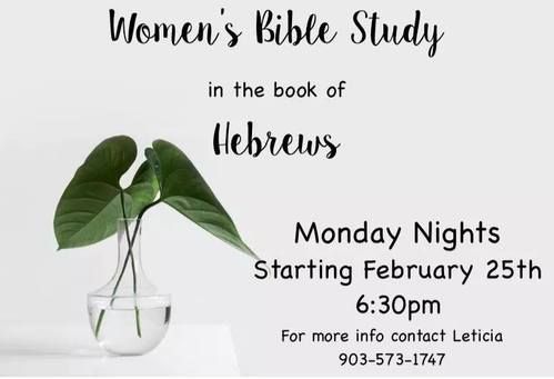 Meetings start at 6:30 pm at the church. Snacks & drinks will be provided ONLY at the Women's fellowship, not the Bible Studies. Please make arrangements for childcare.